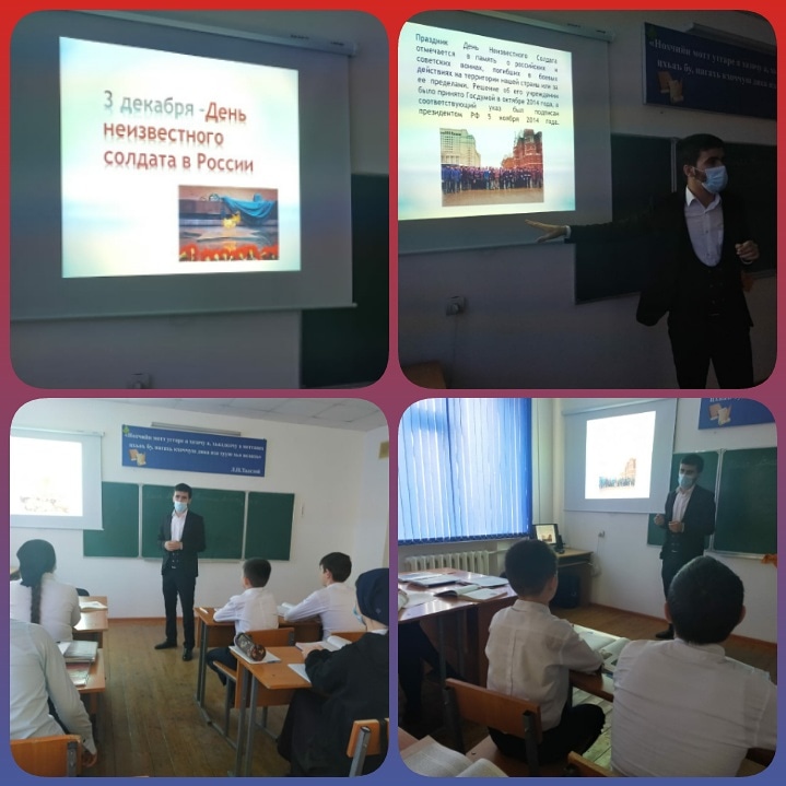 3 декабря 2020 года в МБОУ «СОШ 2 с.п. Горагорское» учителем истории и обществознания Магомадовым А.Ш. был проведен урок памяти, приуроченный ко Дню Неизвестного Солдата среди обучающихся 9-х классов.