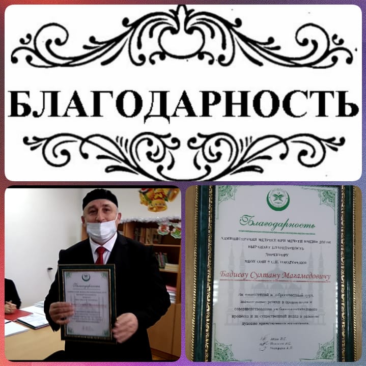 25.12.202025 декабря 2020 года Администрация Медресе при мечети имени Дог1и выразила благодарность директору МБОУ «СОШ 2 с.п. Горагорское» Бадиеву С.М. за многолетний и добросовестный труд, значительные успехи в организации и совершенствовании учебно- воспитательного процесса и за существенный вклад в развитии духовно- нравственного воспитания.