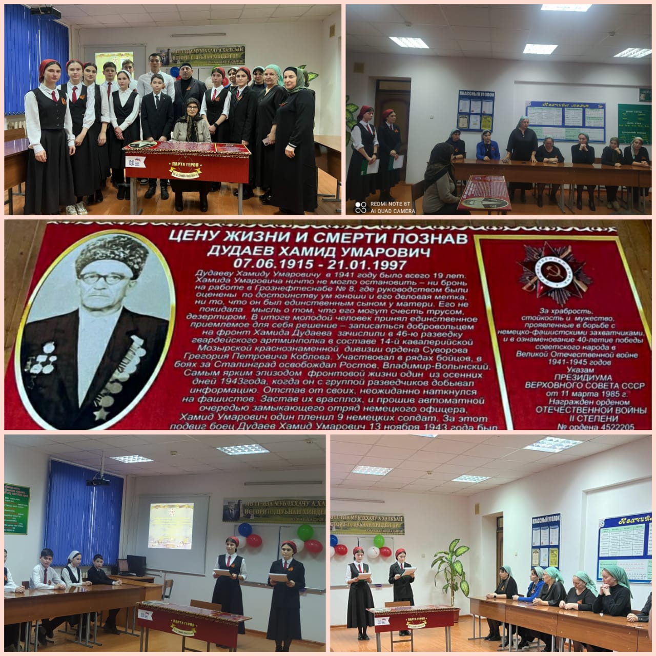 На мероприятии ученики 11 класса рассказали о мужестве и стойкости Дудаева Хамида Умаровича. В 1941 году ему было всего 19 лет. Хамида Умаровича ничто не могло остановить: ни бронь на работе в Грознефтеснабе, где руководством были оценены по достоинству ум юноши и его деловая метка, не то, что он был единственным сыном у матери. Его не покидала мысль о том, что его могут счесть трусом и дезертиром.